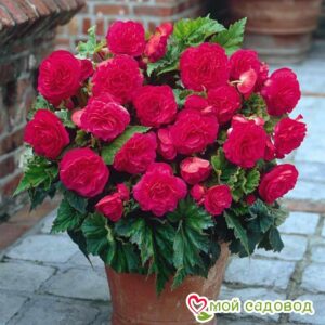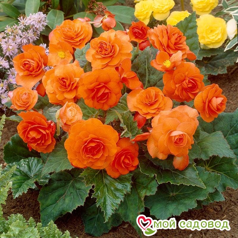 Бегония махровая оранжевая – клубневое растение высотой 25-35см. Красивы ее зеленые сердцеобразные листья с неровно зубчатыми краями, прекрасны и махровые оранжевые цветки, похожие на розочки, диаметром до 11см. Бегония хороша для озеленения помещений, лоджий, балконов и для клумб, цветников и рабаток. В районах с мягким климатом разводят в открытом грунте, в более холодных районах высаживают на балконах или в саду только на летний период. Бегония любит рыхлый питательный грунт со слабокислой реакцией. Оптимальная схема посадки 20х30 см.Сделайте дренаж. Поливайте регулярно и умеренно. Раз в месяц подкармливайте минеральным удобрением. В период покоя обеспечьте прохладную зимовку. Чтобы растения зацвели к началу лета, посев на рассаду делают в январе-марте. Заделка не требуется. Просто равномерно распределите по рыхлому торфяному субстрату.